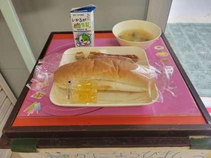 パン、牛乳、ウインナーのケチャップソース、スープ、焼きかぼちゃ