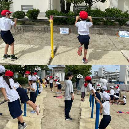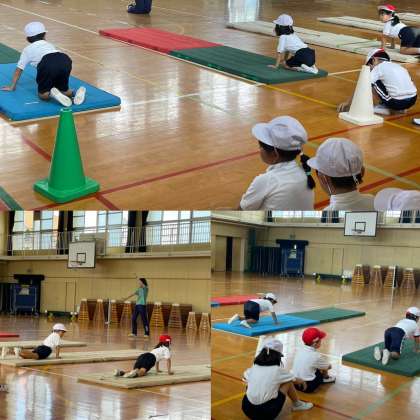 鉄棒では、お手本を参考に動きを練習しています。マット運動では、スムーズな動きに気をつけて練習しています。マット運動では、スムーズな動きに気をつけて練習しています。