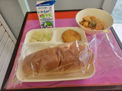 パン、牛乳、チキンレバーカツ、ケチャップ煮、キャベツのバジル風味サラダ