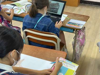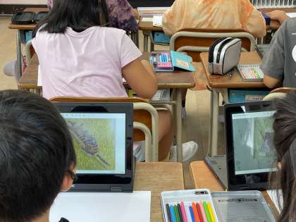 これまで学習してきたことを振り返り、紙しばいを作っています。完成したものは、1年生へ読みます。タブレットを活用して作っています。