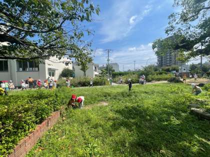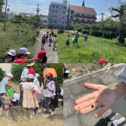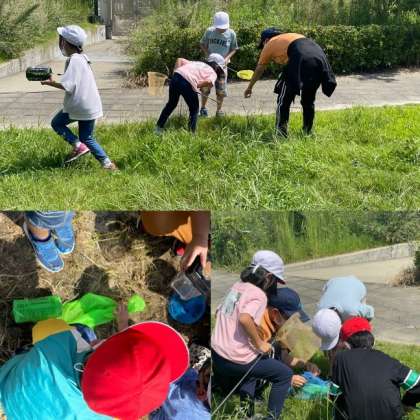 淡路中学校の中庭で、虫探しをしました。バッタやてんとう虫、トンボを見つけて、昆虫採集もしました。