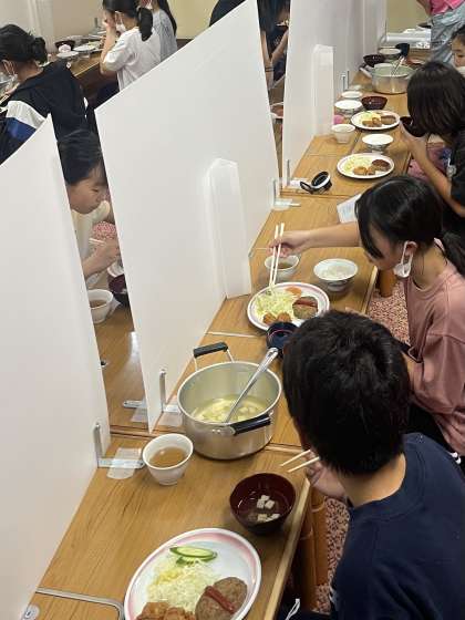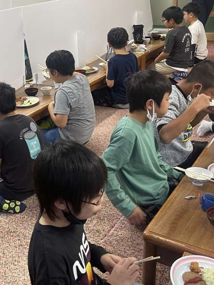 お風呂も終わり、夕食です。食後はキャンプファイヤーです。雨もあがり涼しいです。