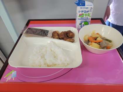 ごはん、牛乳、みそカツ、じゃがいもと野菜の煮もの、焼きのり