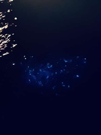 宿舎の方の説明のあと、桟橋で観察しました。青白く光っている様子を観察できました。