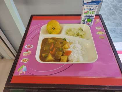 牛乳、ポークカレーライス(米粉)、サワーキャベツ、みかん