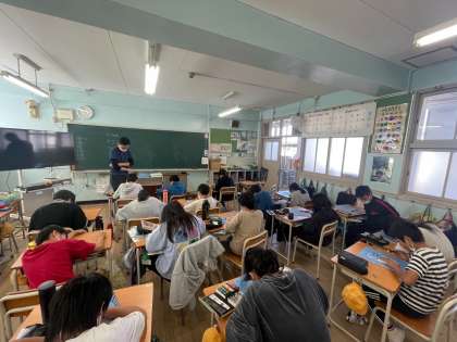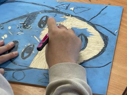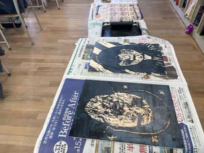 彫刻刀で板を掘り進めています。版画を刷る作業も始まっています。