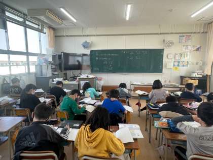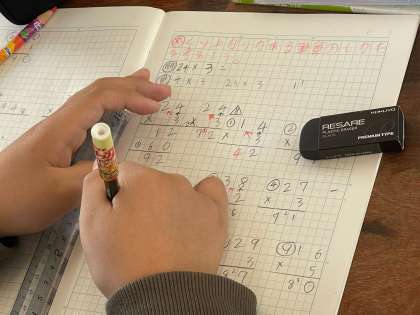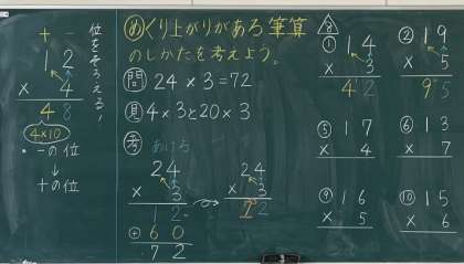 くり上がりのあるかけ算を、筆算で計算する練習をしています。