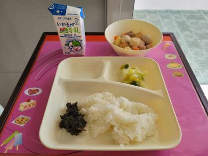 牛乳、ごはん、牛乳、関東煮、はくさいの甘酢あえ、のりのつくだ煮