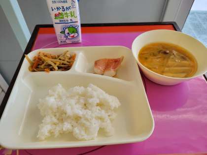ごはん、牛乳、あかうおのしょうゆだれかけ、なめこのみそ汁