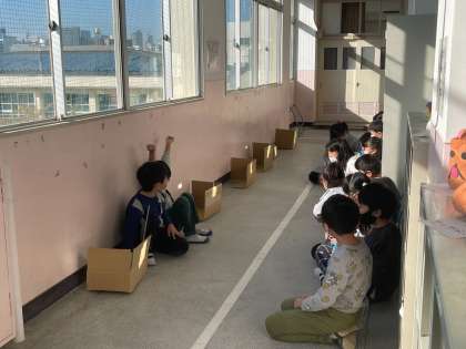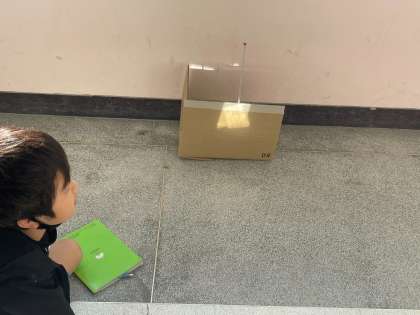 鏡を使って、ダンボールにセットした温度計に反射させ、温度がどうなるか調べています。