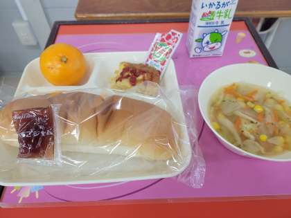 パン、牛乳、ツナポテトオムレツ、鶏肉とキャベツのスープ、みかん