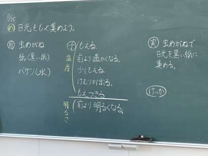 虫メガネを使って、太陽の光を集め、紙を燃やしたり、より明るく光りを集めたりする実験をしています。