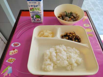 ごはん、牛乳、鶏肉と野菜の煮もの、ひじき豆、かぶのゆず風味