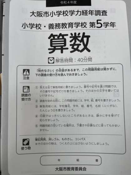 3年〜6年 大阪市小学校学力経年調査2日目 12月7日