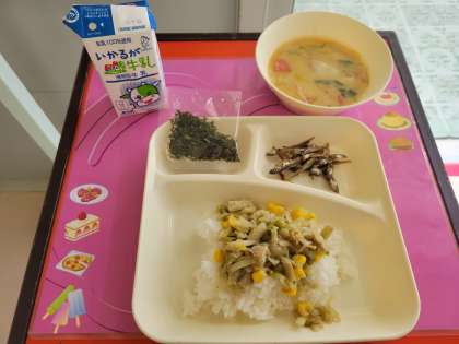 牛乳、きんぴらちらし、ぞう煮、ごまめ