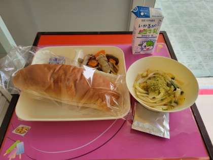 パン、牛乳、豚肉とごぼうの煮もの、なにわうどん、固形チーズ