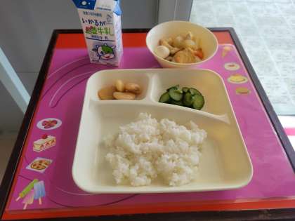 ごはん、牛乳、関東煮、きゅうりの梅風味、白花豆の煮もの