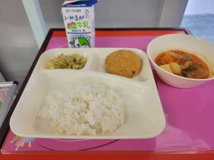 ごはん、牛乳、チキンレバーカツ、ケチャップ煮