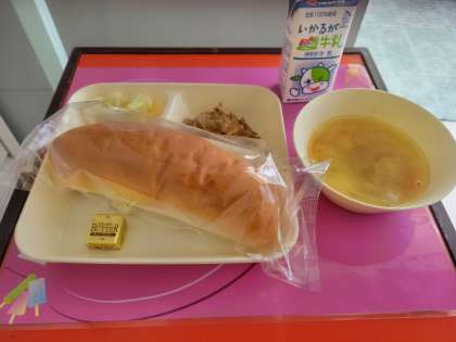 パン、牛乳、豚肉のデミグラスソース、スープ
