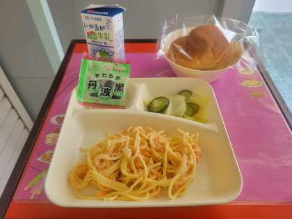 2分の1パン、牛乳、さけのクリームスパゲティ、