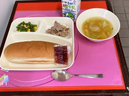 パン、牛乳、豚肉のガーリック焼き、スープ、さんどまめとコーンのサラダです。