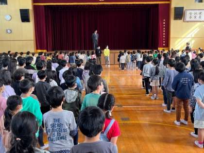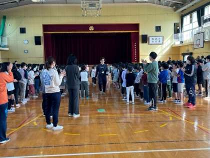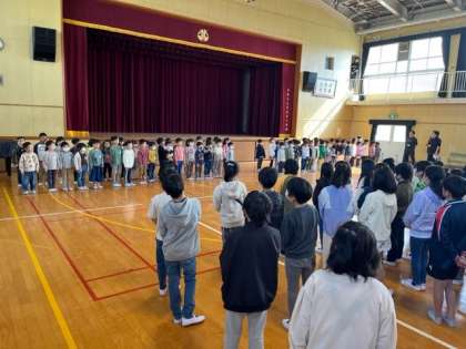 講堂で1年生の対面式を行いました。拍手で迎えられた1年生は、大きな声で「よろしくお願いします」とあいさつができました。高学年も「1年生かわいい!」と大きな拍手を送りました。