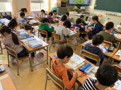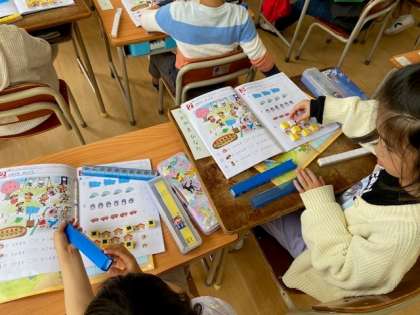 1年生は算数科で「どちらがおおい」の学習をしています。2つの絵を見てどちらが多いかを学習しました。初めて使う算数のブロックを絵の上に置きながら数を確かめます。具体物を操作しながらどんどん問題にチャレンジしていきます。