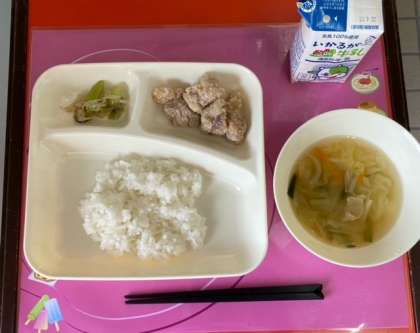 ごはん 牛乳 鶏肉のからあげ 中華スープ チンゲンサイともやしの甘酢あえです。