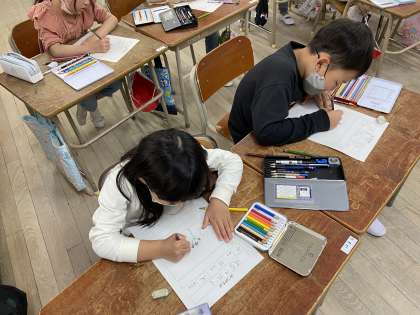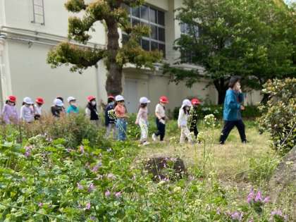 カラスノエンドウやホトケノザ、タンポポの綿毛、シロツメグサ、八重桜などが咲いていました。見つけたものをよ見て観察し、カードに書いて紹介することができました。