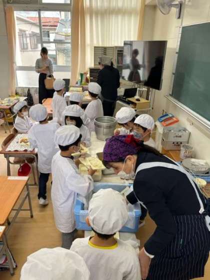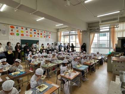 1年生は保護者の方々に見守られながら、給食の時間です。自分たちで給食を運び、配膳します。6年生に助けてもらわなくても、自分たちの力で協力して準備できました。みんなで一緒にいただきま〜す。