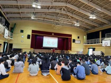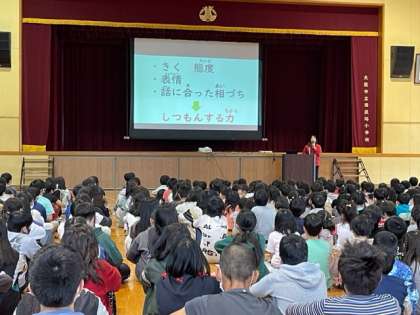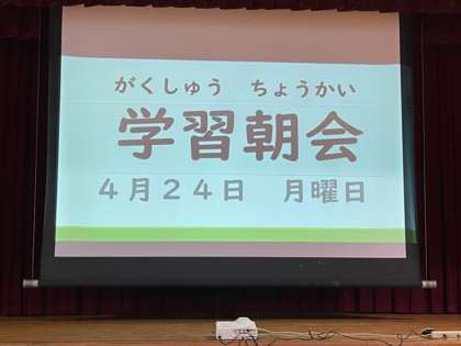 今日の全校朝会は、学習朝会です。学習に関わる集会を月一回行う予定です。
