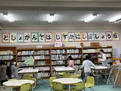 図書館を利用して、図書館学校司書の先生に読み聞かせをしていただきました。また、本を借りる約束の確認をして、読書活動をしています。