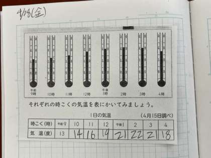 今日は温度計の目盛りを読んで、表に表していきます。細かい目盛りを一生けんめい読んでいます。
