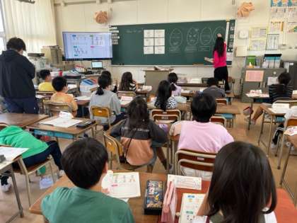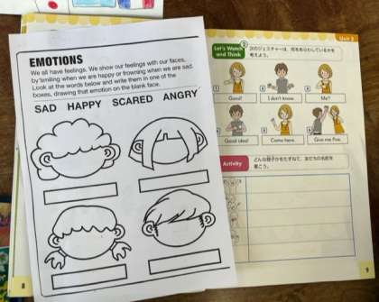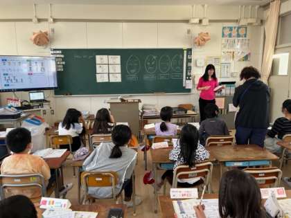 今日もカトリーナ先生と一緒に外国語活動です。気持ちを表す言葉を勉強しています。楽しみながら学習をしています。