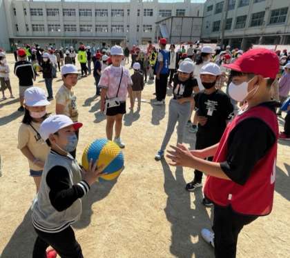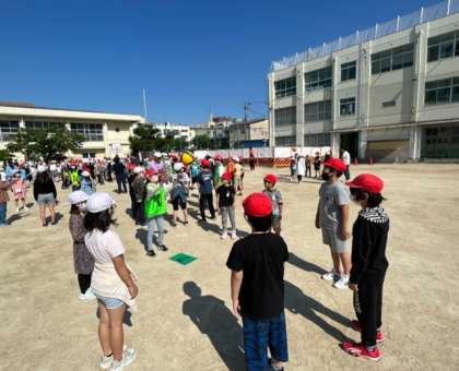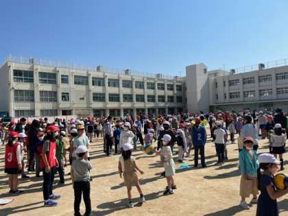 とてもいい天気の中、児童集会を行いました。6年生が1年生を迎えに行って一緒に楽しんでいます。今日は、たてわり班でボールをまわすゲームをしました。集会委員会の子どもたちも司会を頑張っています。