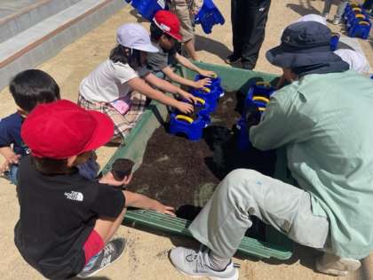 生活科の学習で、朝顔の観察をします。そのための準備で鉢に土を入れています。