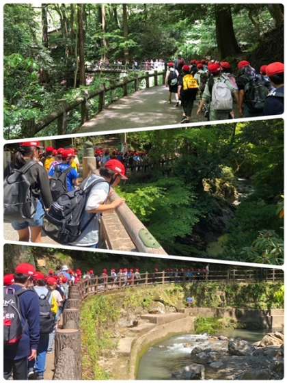 4年生は箕面公園へ遠足に来ています。昆虫館では普段見られない昆虫を観察したり、蝶の部屋へ入ったりしました。山道を歩いている時は「まだかなー」「お腹すいたなあ」と言っていた子どもたちですが、滝が見えると一斉に「滝やーーーー!」と歓声があがりました。お弁当も食べ終わりエネルギー満タンで、帰りも自然を満喫しながら帰ります。