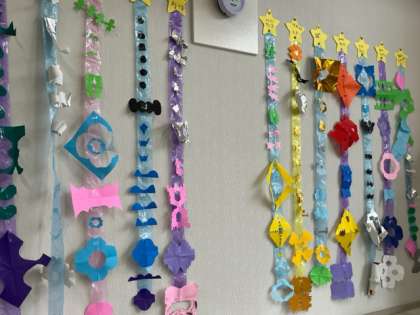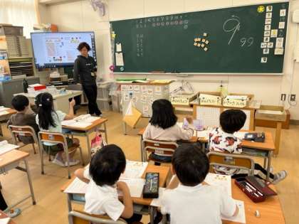 1年生は数の勉強をしています。7は何と何に分けられるかなぁ?色んな答えが出てきて元気に学習しています。教室の後ろには図画工作科で作った飾りがひらひらときれいに飾られています。