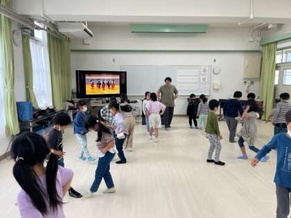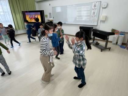 2年生は音楽科で世界の踊りについて学習しています。今日はスウェーデンの踊りです。友だちと手を繋ぎ仲良く踊っていました。自然と笑顔になる2年生とても可愛いです。