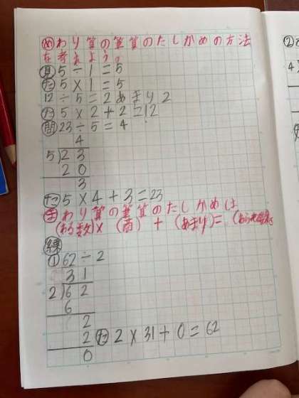 わり算の筆算を学習しています。今日はわり算の筆算の答えのたしかめる方法を考えました。