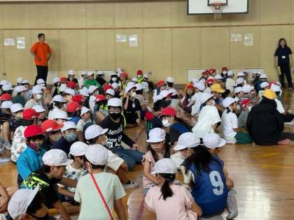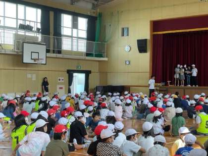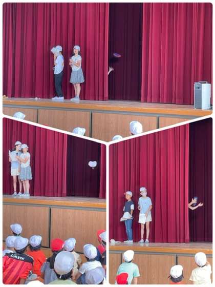 今日の児童集会は、たてわり班で考える「なにが通ったでしょうか」のゲームです。
