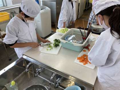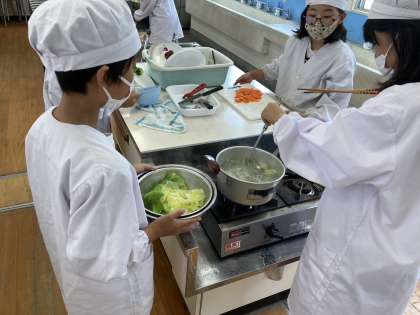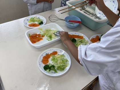 5年生は調理実習でサラダを作りました。野菜を洗い、皮をむいて食べやすいサイズにカットします。ドレッシングも手作りです。野菜が苦手な子もいますが、美味しそうに食べています。
