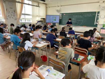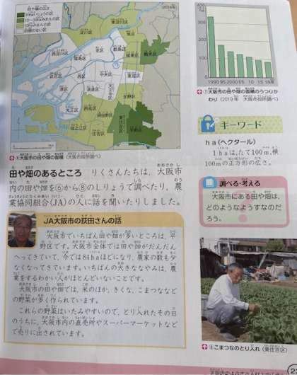 大阪市にある田や畑はどのようなようすかを地図やグラフから読み取り話し合い学習しています。大阪市全体では田や畑がだんだんへってきていることがわかりました。