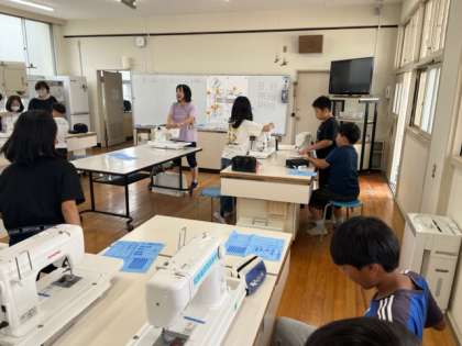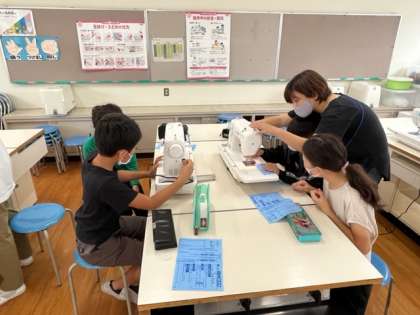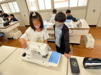 5年生はナップザックづくりに向けてミシンの使い方を学習しています。手順通りに上糸、下糸を通していきます。針が付いているので慎重に作業しています。どんなナップザックが出来上がるか楽しみです。