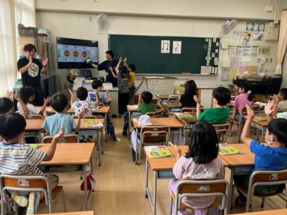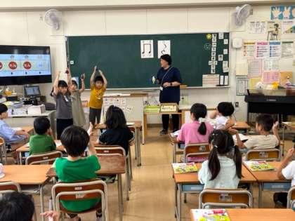一年生はカスタネットを使ってリズム打ちをしています。叩くときは「たん」休むときは「うん」と言いながら叩きます。どんどん音がそろっていきました。元気に頑張る一年生は素敵です。