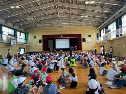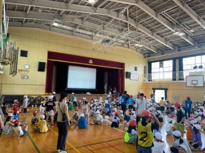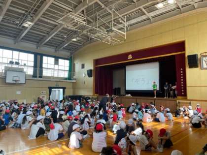 今日の集会は、たてわり班での活動です。ジェスチャーゲームです。かく班で楽しく活動することができました。