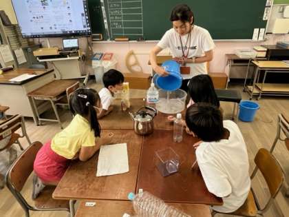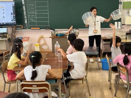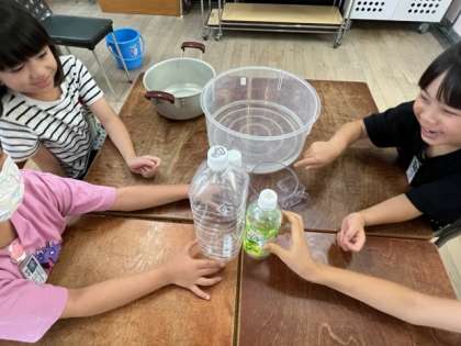2年生は算数の学習で水のかさを調べています。どうやって計ればみんなにわかりやすく説明できるか実際に水を使って調べてみました。ペットボトルやリットル升を使って調べています。
