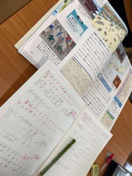 6年生は「聖武天皇はどのようにして世の中を治めようとしたのだろう」をめあてに学習しています。「聖武天皇は、なぜ大仏を作ったの?」の疑問を中心に、みんなで予想し話し合いながら学習することができました。