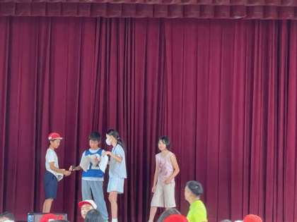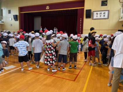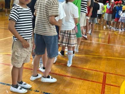 1学期最後の児童集会は、たてわり班でバースデーチェーンをしました。誕生日の順番に並ぶゲームです。