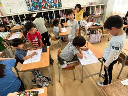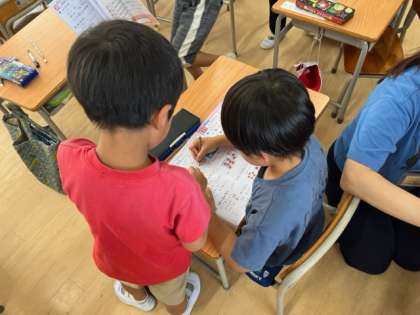 いよいよ1学期もまとめの学習です。1年生は習った足し算や引き算のドリルに取り組んでいます。困った時にはお友だちに相談して一緒に学習しています。ラストスパート頑張って!